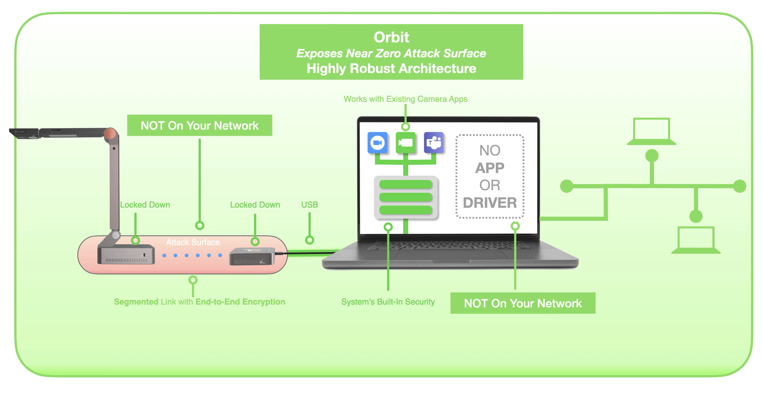Rather than connecting as a network device to your computer, Orbit is the only camera that connects through USB as a locked-down and trusted local device. Orbit is NOT on your network and presents near-zero vulnerabilities.
