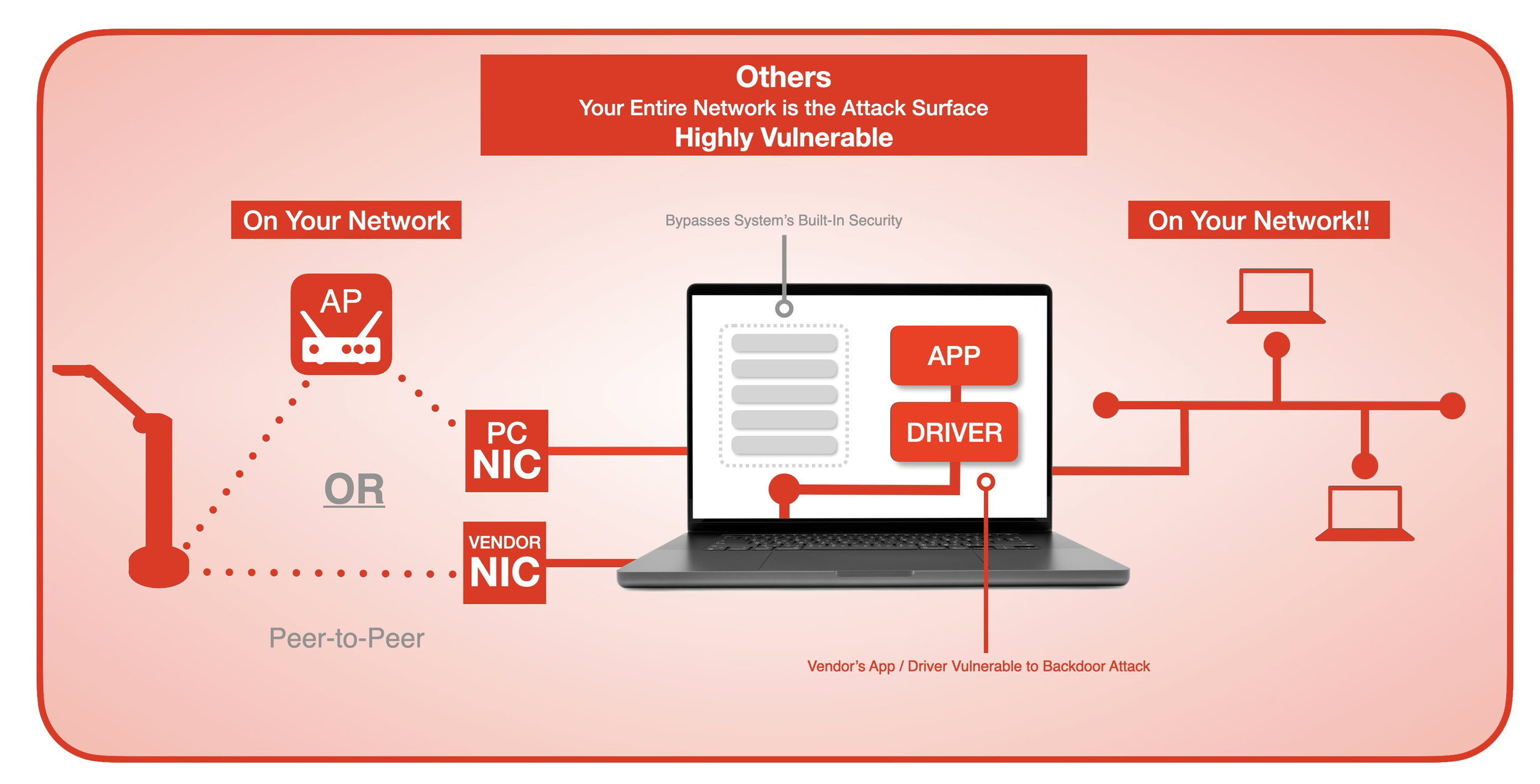 This setup bypasses the system's built-in security, making the entire network vulnerable. The diagram below illustrates this peer-to-peer or vendor NIC approach, where the camera connects via an AP, PC NIC, or vendor NIC, directly integrating with the network and requiring apps/drivers that are prone to backdoor attacks.
